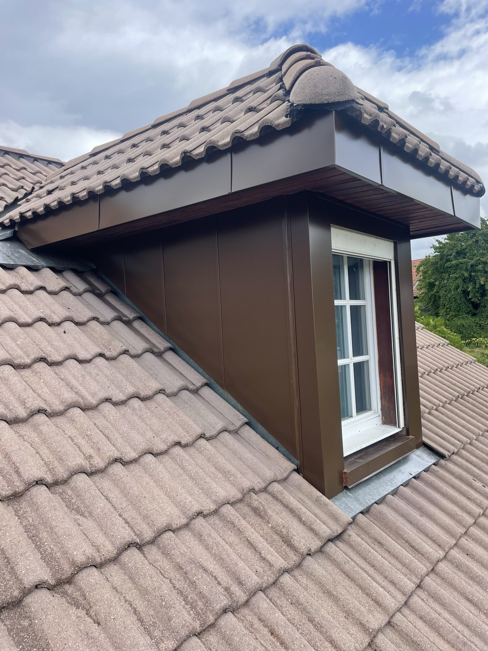 Réalisation de travaux de zinguerie pour des finitions esthétiques et résistantes aux intempéries, incluant les entourages de cheminées, les solins et les habillages de fenêtres de toit.